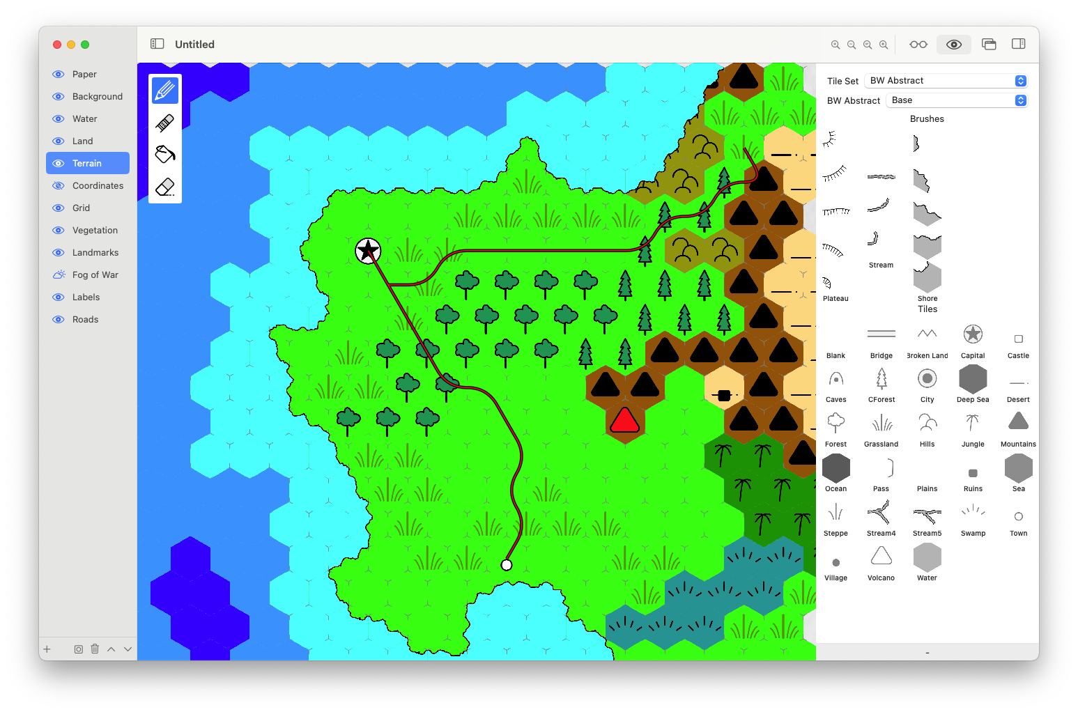 dNland is a hex map editor with support for multiple layers and procedural terrain generation. It is designed for the game master first and foremost, and not cartographic works of art.